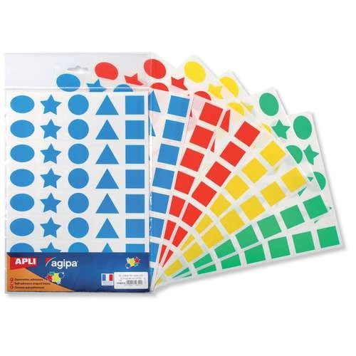 Formes assorties : carrés, ronds, triangles, étoiles et ovales. 2 planches de chacune des couleurs suivantes : bleu, rouge, jaune, vert.