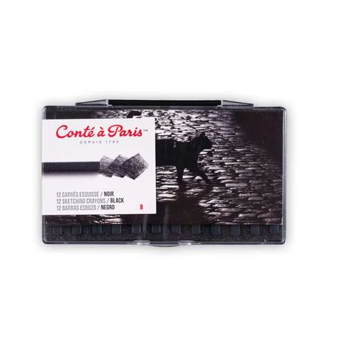 Ils sont ensuite cuits par extrusion et séchage, tels des pastels. Le degré de cuisson permet une variation du degré de dureté. Véritable référence pour les artistes, le carré Conté présente une forte pigmentation qui offre une superbe intensité de couleur. Estompez régulièrement avec les doigts pour adoucir les passages de l’ombre à la lumière. Il est conseillé d’utiliser un couteau très tranchant ou du papier de verre pour tailler et donner la forme désirée aux carrés.