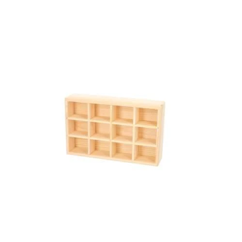 Les sections se retirent pour varier soi-même les compartiments. Le coffret est fabriqué en pin, les séparateurs de compartiment sont amovibles, pour varier le nombre et la taille des compartiments à volonté. Tous les compartiments ont la même dimension : 4,6 x 3,6 x 3,6 cm.