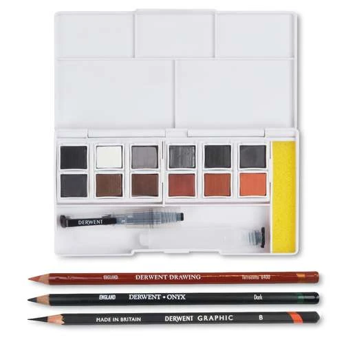 Le coffret Mixed Media de Derwent possède 12 1/2 godets d’aquarelle Inktense, Graphitint, fusain teinté, pastels, 1 crayon Drawing terre cuite, 1 crayon Onyx foncé, 1 crayon Graphic B, 1 mini-pinceau à réservoir, et 1 éponge.