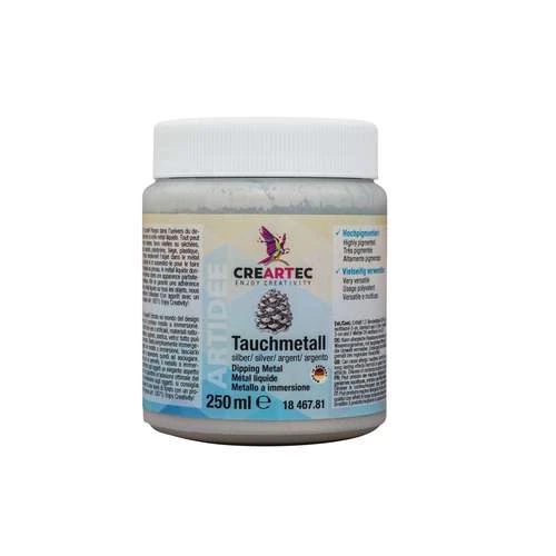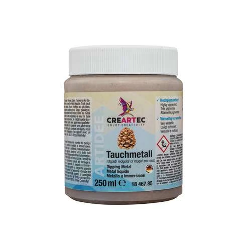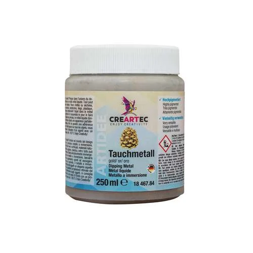 Dispersion métallique très fluide et liquide parsemée de particules microfines en laiton, en cuivre ou en argent. Plongez l’objet directement dans le médium ou appliquez la dispersion en métal avec un pinceau sur l’objet en plusieurs couches.