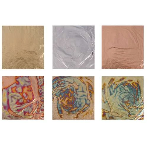 Ces feuilles de métal frappées, légères comme un souffle (1/2 000 mm d’épaisseur), exaltent le papier, le carton, le bois, le verre, les matières plastiques, le polystyrène, la porcelaine, le métal, les bijoux fantaisies, les matériaux naturels (pierres, feuilles de plantes, coquillages, pommes de pin…), les boules en plastique, les bougies, etc.