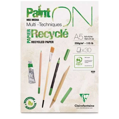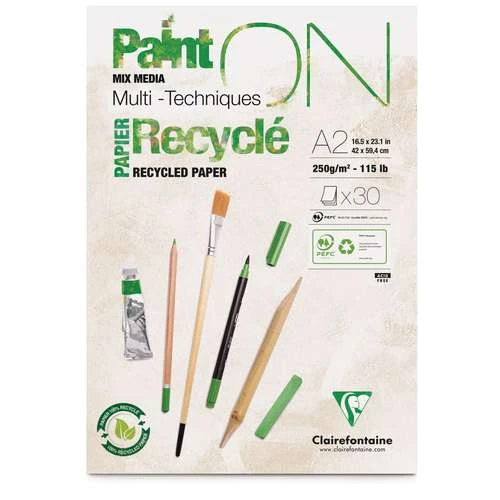 Avec un grammage de 250 g/m², ce papier offre une bonne capacité d’absorption et permet le repentir. Dans cette version du Paint’On Recyclé, Clairefontaine a développé un papier 100% recyclé qui offre des sensations semblables à un papier neuf. Avec un grain fin, il est idéal pour les travaux de détails.