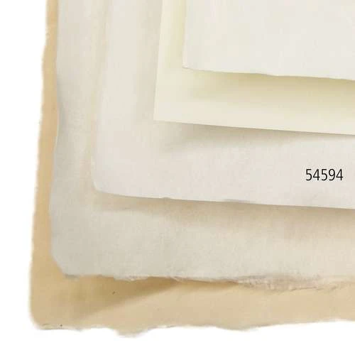 Blanc. 1 face grain fin, 1 face mate. 70 % Kozo et 30 % pâte de bois. 2 bords frangés. pH neutre.