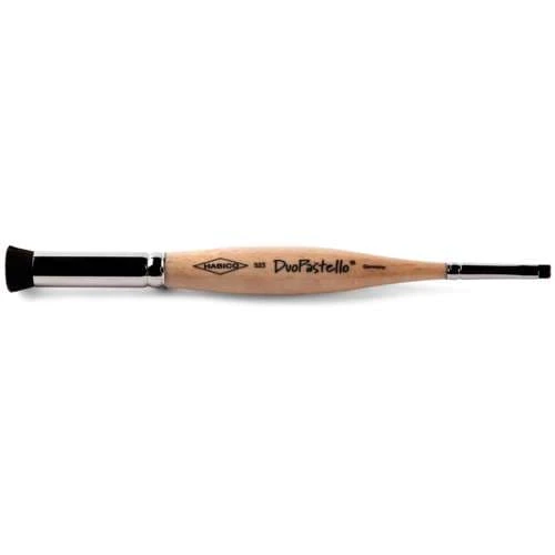 Le DuoPastello est un pinceau à deux pointes spécialement conçu pour pratiquer les techniques d´estompe au pastel. Contrairement aux pinceaux classiques ou à l´estompe, le pinceau DuoPastello permet, grâce à ses deux pointes de formes différentes, d´étaler la couleur de manière plus subtile et plus régulière. La pointe naturelle en poils de poney est aplatie et ronde afin d´estomper de larges surfaces mais également des zones plus petites et délicates. La seconde pointe, plus courte, est constituée de fibres synthétiques resserrées. Elle est destinée à la réalisation de détails.
