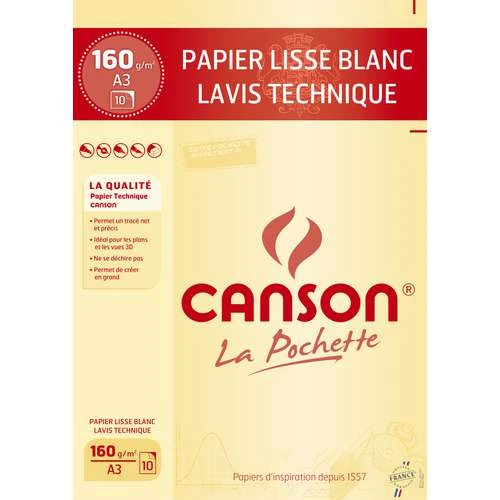 Pochette de 12 feuilles à dessin technique Canson – papier très lisse idéal pour le dessin au crayon, à l’encre (stylo tubulaire) et les lavis. Sa surface dure permet d’effectuer des corrections par grattage.