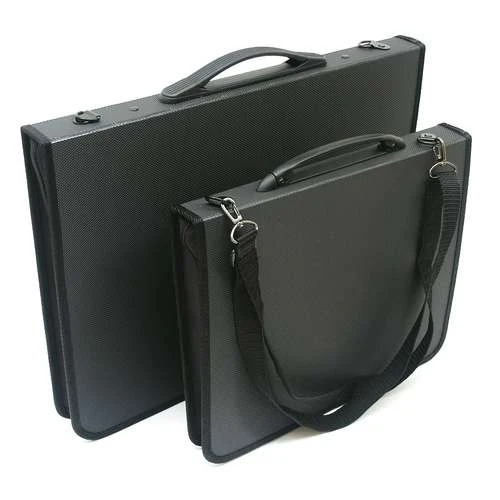 Le Press-book Gerstaecker, un summum de confort et d’élégance pour transporter vos documents : couverture en vinyle noir à grain marqué, coins arrondis et renforcés, bandoulière réglable et amovible, fermeture éclair et anneaux solides intégrés pour les pochettes. Les press-book A4 et A3 ont une capacité de 25 pochettes, le press-book A2 peut contenir 20 pochettes et le A1 15 pochettes.