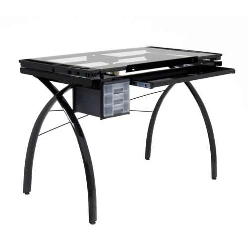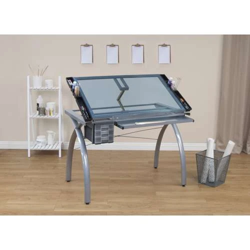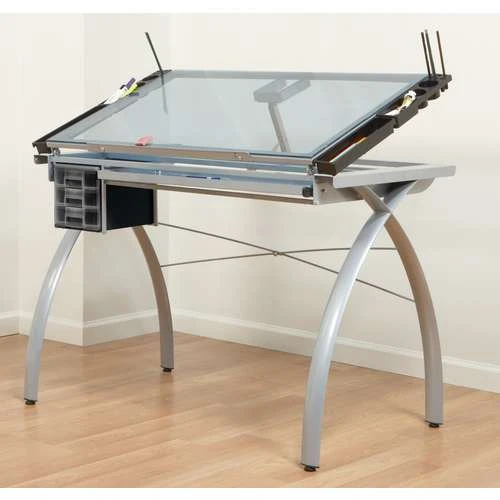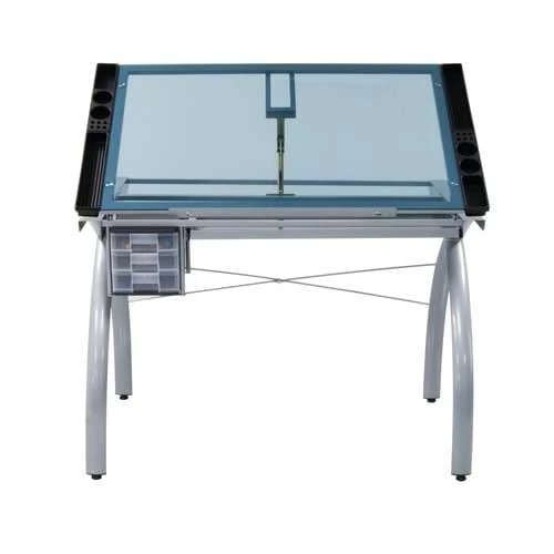 La table à dessin Futura est de très haute qualité, à la fois esthétique et pratique. Design futuriste et superbe plateau en verre bleu ou transparent pour un grand confort de travail et de multiples espaces de rangement pour votre matériel. Peut être utilisée comme table lumineuse en fixant une tablette lumineuse Ligt Pad sous la plaque en verre à l’aide des barres de support. Poids : 22,5 kg. Le nettoyage du verre se fait à l’aide d’un produit pour vitre ou verre. Pour toute utilisation d’un solvant fort, nous vous conseillons de faire un essai sur une petite surface.