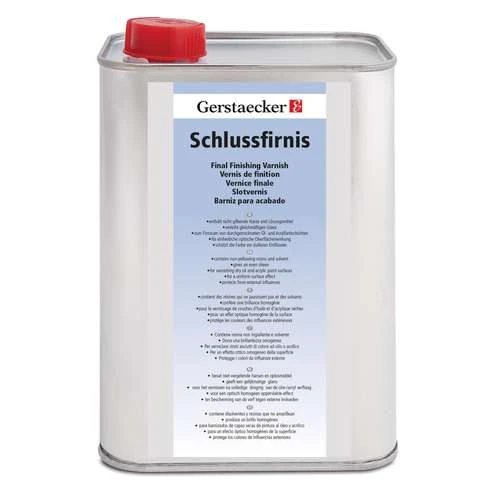 Le vernis de finition Gerstaecker se compose d´un mélange non jaunissant de résine synthétique et d´essence de térébenthine purifiée. Le vernis possède une grande viscosité et ne colle pas.